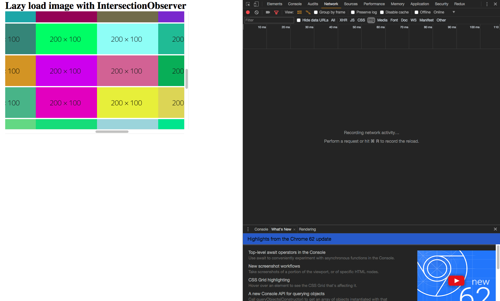 이 방법에서는 scroll을 추적하여 lazy load할 이미지들 중 보이는 이미지들의 src에 주소를 할당하여 이미지를 불러오도록 처리하였다. 이 방법에서 이미지들이 보이는지 여부를 확인하기 위하여 collisionCheck라는 별도의 메서드를 만들어 충돌을 확인하였다.