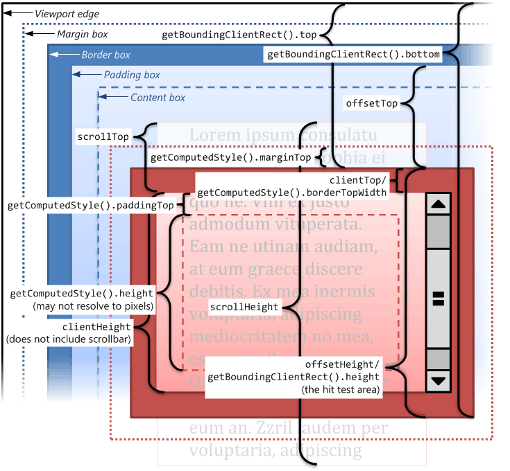 offsetHeight와 clientHeight의 차이점을 찾아보다 MSDN에서 관련된 이미지들을 보았다. offsetHeight와 clientHeight 뿐만 아니라 엘리먼트에 대한 치수와 위치에 대해 확인할 수 있다.