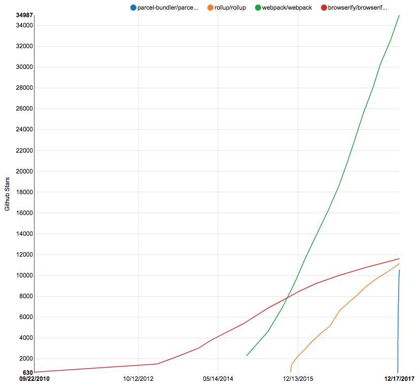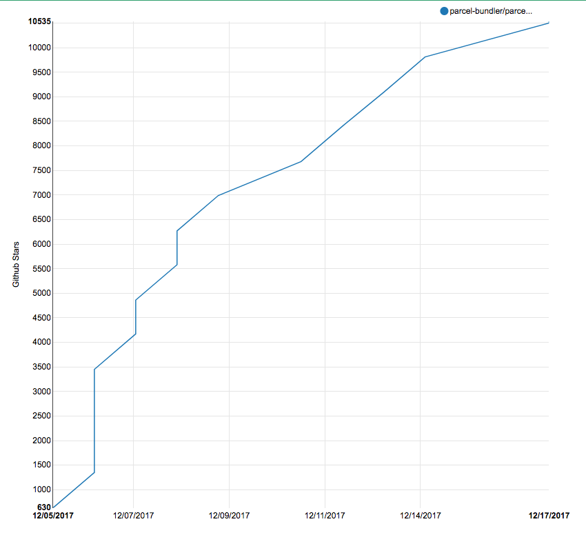 최근 프론트엔드를 개발하면서 코드와 의존성을 하나로 묶어주는 반들러(Bundler)는 떼어놓고 생각할 수 없을 정도로 기본적인 도구이다. 오래전부터 사용되어온 Browserify나 Bundler의 대명사 같은 Webpack뿐 아니라 Rollup을 본지도 얼마 되지 않은 것 같은데, 또다시 주목받는 Bundler가 나타났다. 상단의 이미지와 같이 2주 정도 만에 Github에서 Star의 개수가 만 개가량 증가한 것을 보면 Parcel[파설, /parsəl/]에 대한 사람들의 관심이 어느 정도인지 알 수 있다.